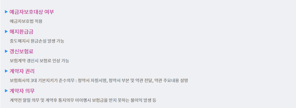 보험료, 보장범위 등의 기본 정보를 비교하여 자신에게 가장 적합한 보험을 선택할 수 있습니다. 또한 보험협회를 통해 각 업체별, 상품별 유지보수 기간별 지급기준, 보장금액, 공시금리, 해지환급금 수준 등을 조회할 수 있어 가입한 보험을 비교하고 확인할 수 있습니다.