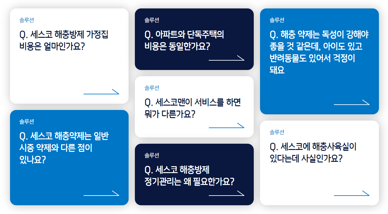 세스코는 바퀴벌레 퇴치 전문 업체로, 안전한 약제 사용, 철저한 점검과 분석, 꼼꼼한 처리와 관리를 통해 최상의 서비스를 제공합니다.